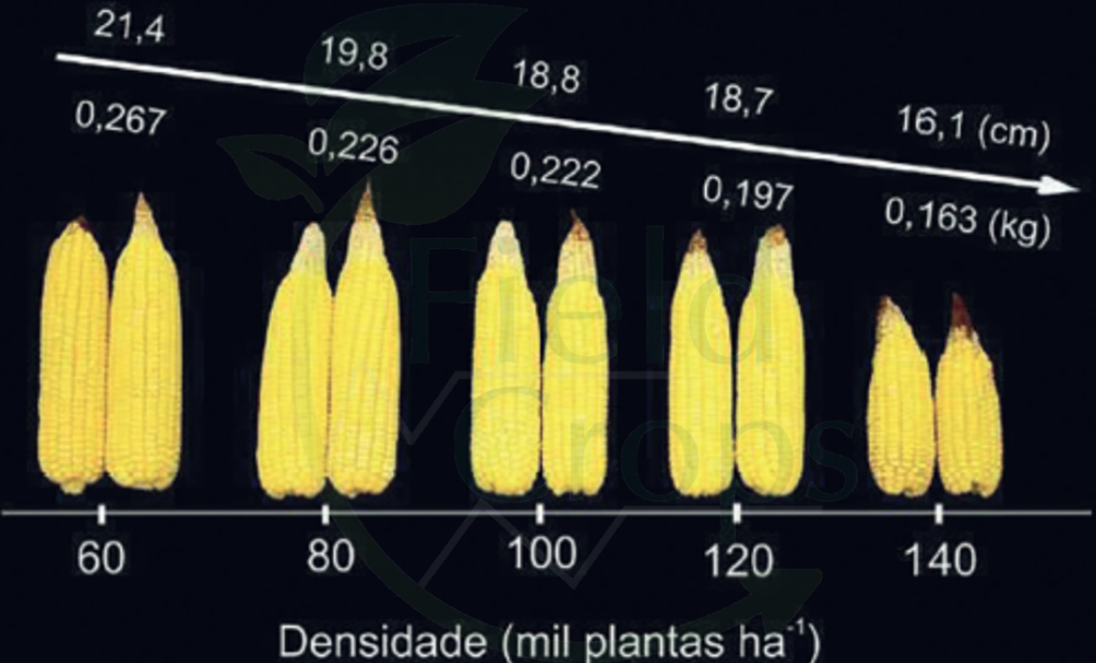 O valor da DAO para o milho tem apresentado contínuas alterações ao longo do tempo, em grande parte devido ao melhoramento genético e às novas práticas de manejo. Por exemplo, nas décadas de 70, 80 e 90, os valores de DAO eram dee 7,1, 7,9 e 8,5 plantas m-2, respectivamente (Assefa et al., 2018). As modificações estruturais da planta promovidas pelo melhoramento genético, como a perda da capacidade de perfilhamento em híbridos modernos cultivados no Brasil, possibilitaram um aumento na eficiência de produção de grãos, mesmo sob alta densidade. Atualmente, os híbridos compensam as variações na densidade de plantas com adaptações no tamanho e na massa das espigas (Figura 1).