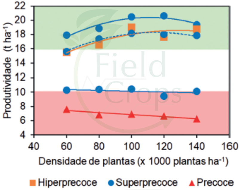 No caso do genótipo superprecoce, observa-se que, no ambiente de AP, a produtividade aumenta à medida que a densidade é elevada, atingindo um máximo entre 100 e 120 plantas ha-1, Por outro lado, no ambiente de BP, não ocorre o mesmo incremento de produtividade (Figura 2). Esta diferença reforça que a produtividade é regulada pela complexa interação entre genótipo, ambiente e manejo.