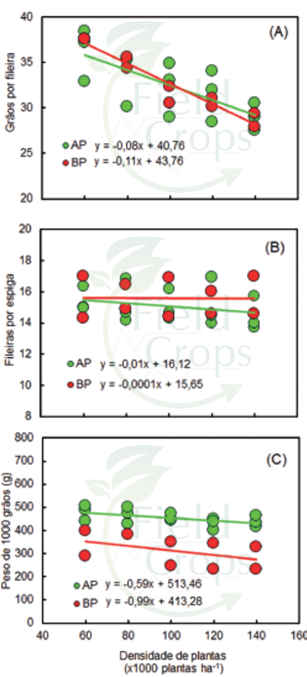 Figura 3. Relação entre a densidade de plantas e demais componentes de produtividade de milho. Grãos por fileira (A), fileiras por espiga (B) e peso de mil grãos (C) em ambientes de alta produtividade (AP) e baixa produtividade (BP).