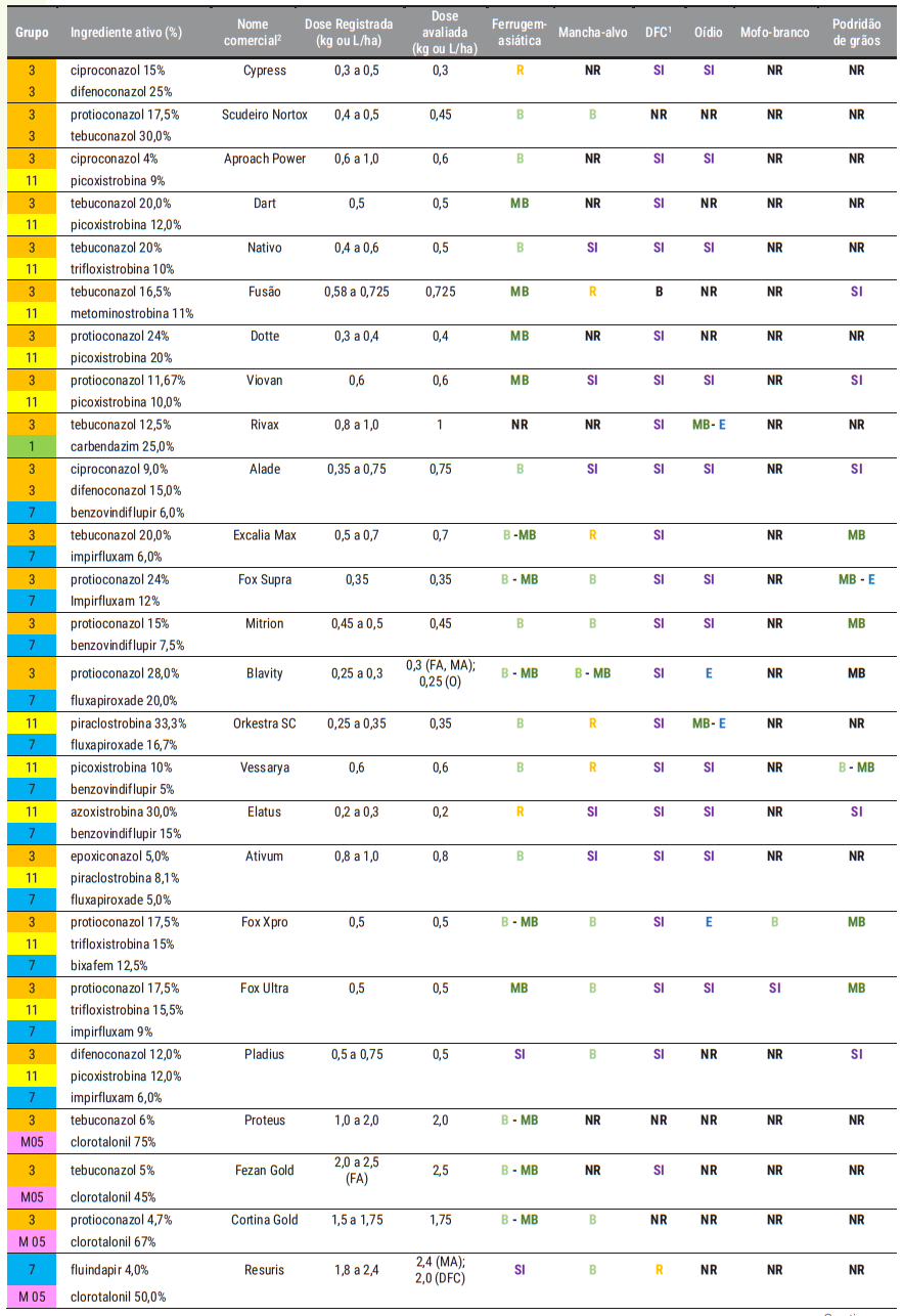 Tabela 1. Eficácia de fungicidas para controle da ferrugem-asiática – FA (P. pachyrhizi), da mancha-alvo – MA (C. cassiicola), das doenças de fim de ciclo – DFC (Cercospora spp. e S. glycines), do oídio – O (E. diffusa), do mofo-branco – MB (S. sclerotiorum) e da podridão de grãos – PG (Diaporthe spp. e Fusarium spp.) na cultura da soja. Categorias: F – Fraca eficácia (0% – 20%); R – Razoável eficácia (20% – 40%); B – Boa eficácia (40% – 60%); MB – Muito boa eficácia (60% – 80%); E – Excelente eficácia (80% – 100%); NR (não registrado) – Produto não registrado para a doença; SI (sem informação) – Produto registrado, mas sem informações na rede de ensaios para a classificação.