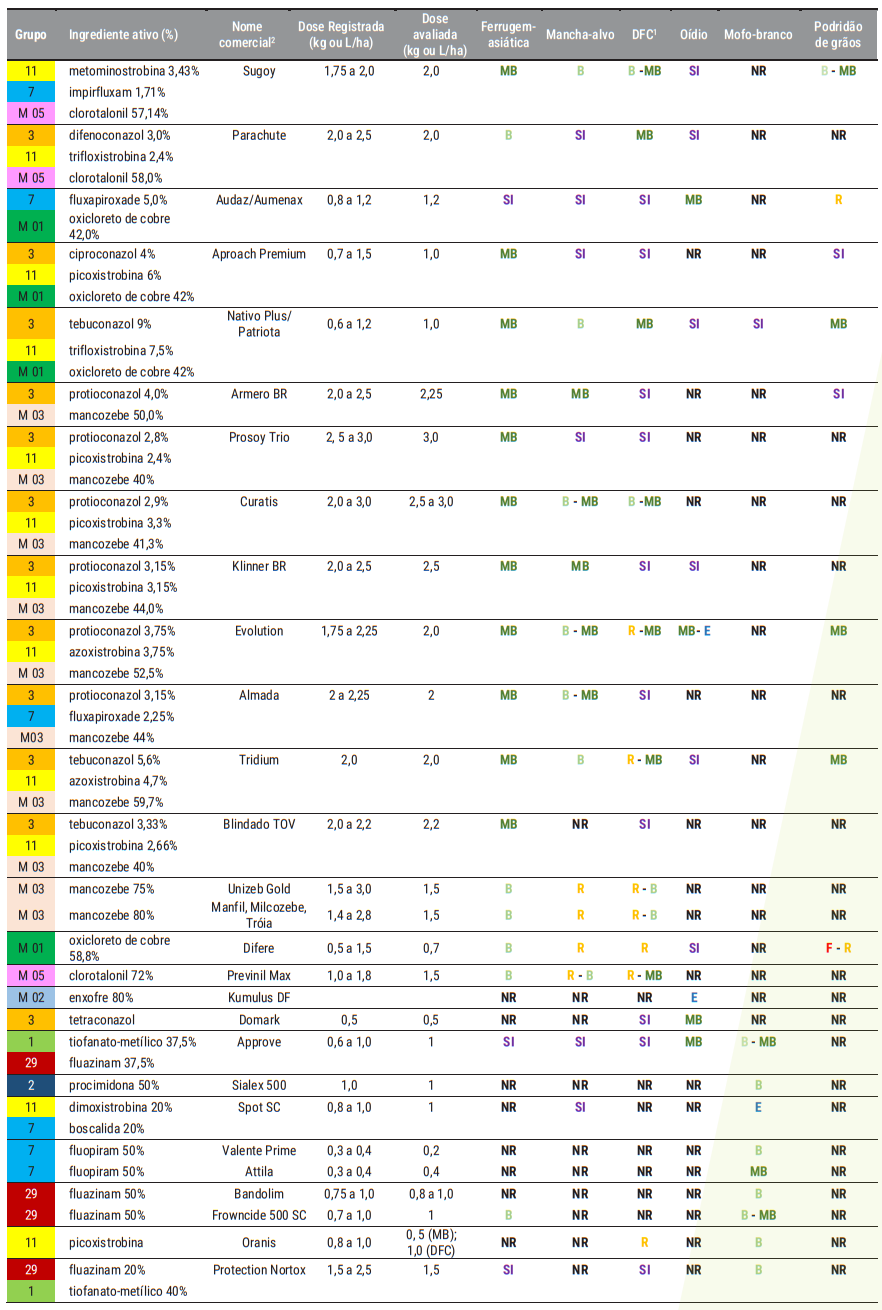 GODOY, C. V. et al. EFICIÊNCIA DE FUNGICIDAS PARA O CONTROLE DA FERRUGEM ASIÁTICA DA SOJA, Phakopsora pachyrhizi, NA SAFRA 2023/2024: RESULTADOS SUMARIZADOS DOS ENSAIOS COOPERATIVOS. Embrapa Soja, 2024. Disponível em: < https://www.infoteca.cnptia.embrapa.br/infoteca/bitstream/doc/1165843/1/CT-206-Claudia-Godoy.pdf >, acesso em: 07/10/2025.