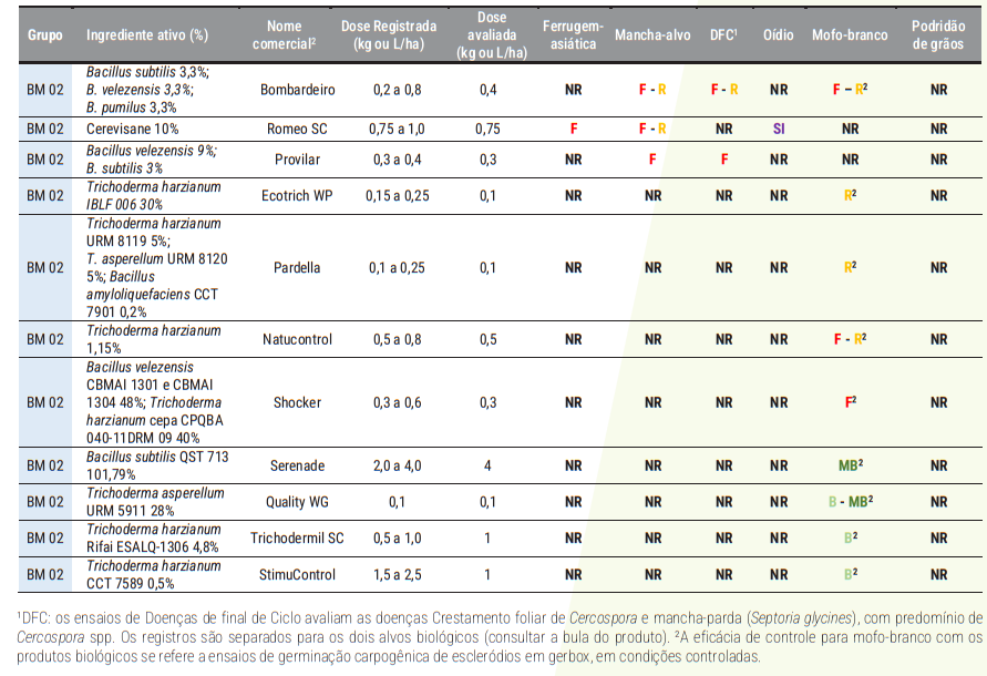 Embora os resultados não contemplem todos os fungicidas registrados para cada doenças da cultura da soja, os principais, mais utilizados e avaliados ao longo dos anos pela rede de ensaios estão presentes na tabela abaixo. Vale destacar que as classificações de eficácia são baseadas nos níveis de controle da doença alcançado pelo produto em aplicações sequenciais. No entanto, isso não constitui uma recomendação de controle. As informações devem ser utilizadas dentro de um sistema de manejo, priorizando sempre a rotação de fungicidas com diferentes modos de ação para retardar o surgimento de resistência do fungo aos fungicidas (Embrapa, 2025).