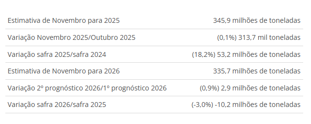A safra brasileira de grãos (cereais, leguminosas e oleaginosas), em 2025, deve somar 335,7 milhões de toneladas, declínio de 3,0% em relação a 2025 ou 10,2 milhões de toneladas. O declínio da produção em relação à safra 2025 deve-se à menor estimativa prevista, principalmente, para o milho (-6,8% ou -9,6 milhões de toneladas, sendo crescimento de 6,4% relativo à 1ª safra e declínio de 9,7% em relação à 2ª safra), para o sorgo (-14,6% ou -787,9 mil toneladas), para o arroz (-8,0% ou -1,0 milhão de toneladas), para o algodão herbáceo – em caroço (-11,6% ou -1,1 milhão de toneladas), para o trigo (-4,0% ou -319,2 mil toneladas) e para o feijão 1ª safra (-3,5% ou -33,6 mil toneladas).