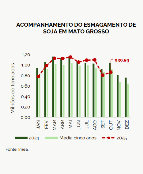 Em out/25, o esmagamento de soja em Mato Grosso atingiu 930,59 mil t, representando um incremento de 6,91% em comparação com set/25