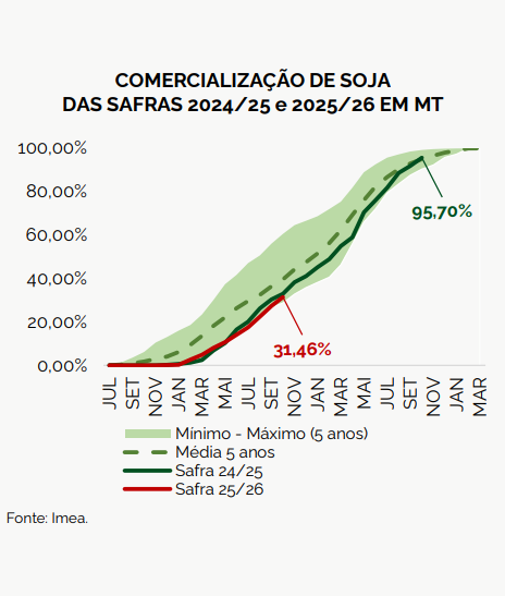 Em relação ao valor negociado, o preço médio fechou em R$ 120,53/sc, representando um recuo de 0,94% em relação ao mês anterior.Quanto à safra 2025/26, as negociações em Mato Grosso alcançaram 31,46% da produção prevista em, um avanço de 4,06 p.p. em comparação ao mês anterior.