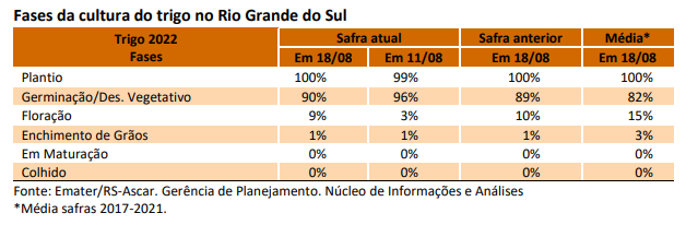 4% em estágio de floração. O excesso de umidade tem provocado forte pressão das doenças fúngicas sobre as plantas de trigo.