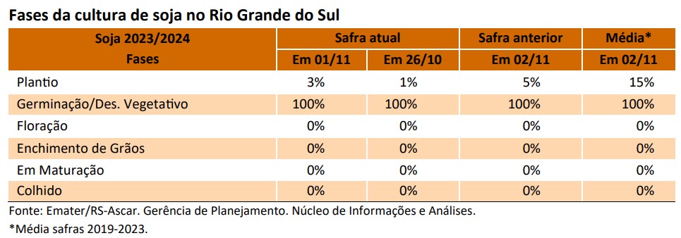 Na de Santa Maria, o plantio segue em ritmo lento devido à sequência de chuvas. Até o momento, apenas 7% da área total planejada foi semeada. A intensificação do plantio deve ocorrer durante a primeira quinzena de novembro.