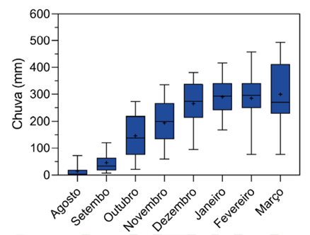 A elevada rentabilidade do algodão faz dessa cultura o componente central do sistema, o que torna o cultivo da soja mais desafiador. A janela de semeadura da soja é curta e exige planejamento preciso para garantir altas produtividades em ambas as culturas. Para viabilizar a semeadura do algodão no início de janeiro, produtores que adotam esse sistema precisam ajustar tanto a época de semeadura quanto a escolha da cultivar de soja. Esse ajuste, porém, frequentemente leva à antecipação da semeadura da soja, mesmo sem condições ideais de umidade no solo, prática conhecida como “semeadura no pó”. Essa estratégia aumenta o risco produtivo da soja, devido à irregularidade no volume e na distribuição das chuvas durante os meses de semeadura precoce (agosto e setembro) (Figura 1).