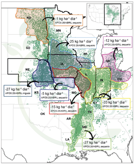 A produção de soja nos Estados Unidos (EUA) estende-se, em latitude, desde o norte da Dakota do Norte (49°N) até a Louisiana (30°N) e, em longitude, de Nebraska (104°O) até a Pensilvânia (76°O). De modo geral, o período ideal para a semeadura da soja nessa região compreende a última quinzena de abril e a primeira semana de maio. Nessa janela, o estabelecimento da cultura ocorre de forma mais rápida e uniforme, fator crucial para a consolidação do potencial produtivo (Edreira et al., 2017; Morris et al., 2021).