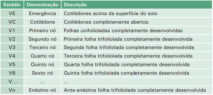 Estádios específicos são identificados por números, após o V ou o R. VE (emergência) e VC (cotilédone) são identificados apenas por letras. A partir do VC, Fehr & Caviness (1977) caracterizam os estádios vegetativos, usando o desenvolvimento da folha imediatamente acima. Considera-se folha completamente desenvolvida a folha aberta cujas bordas dos folíolos da folha do nó imediatamente superior não mais se tocam (Neumaier et al., 2020).