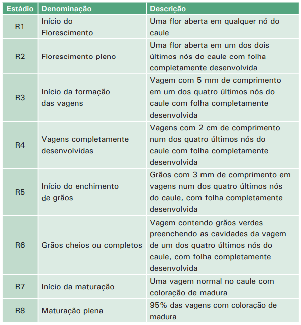 Já os estádios reprodutivos representados pela letra “R” são subdivididos em períodos, em que, R1 e R2 correspondem ao florescimento, R3 e R4 correspondem ao desenvolvimento de legumes, R5 e R6 correspondem ao desenvolvimento dos grãos e R7 e R8 representam a maturação da planta.