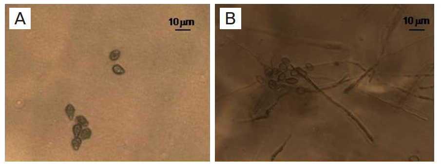 Figura 1. Uredosporos de Phakopsora pachyrhizi não germinados (A) e germinados (B).