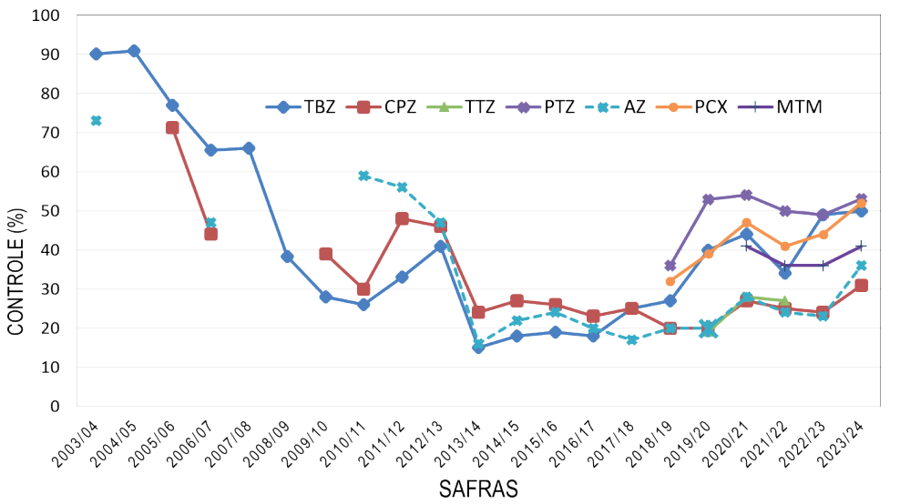 Figura 4. Média da porcentagem de controle da ferrugem-asiática com os fungicidas tebuconazol (TBZ), ciproconazol (CPZ), tetraconazol (TTZ), protioconazol (PTZ), azoxistrobina (AZ), picoxistrobina (PCX) e metominostrobina (MTM) nos experimentos (n) cooperativos nas safras: 2003/2004 (n=11), 2004/2005 (n=20), 2005/2006 (n=15), 2006/2007 (n=10), 2007/2008 (n=7), 2008/2009 (n=23), 2009/2010 (n=15), 2010/2011 (n=11), 2011/2012 (n=11), 2012/2013 (n=21), 2013/2014 (n=16), 2014/2015 (n=21), 2015/2016 (n=23), 2016/2017 (n=32), 2017/2018 (n=26), 2018/2019 (n=25), 2019/2020 (n=14), 2020/2021 (n=19), 2021/2022 (n=19), 2022/2023 (n=18) e 2023/2024 (n=12) em diferentes regiões produtoras de soja no Brasil.