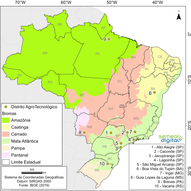 Os DAT do projeto Semear Digital estão distribuídos em 10 municípios de seis estados e quatro biomas: Mata Atlântica, com Alto Alegre (SP), Caconde (SP), Jacupiranga (SP), Lagoinha (SP), São Miguel Arcanjo (SP), Ingaí (MG) e Vacaria (RS); Amazônia, com Breves (PA); Cerrado, com Guia Lopes da Laguna (MS); e Caatinga, com Boa Vista do Tupim (BA).