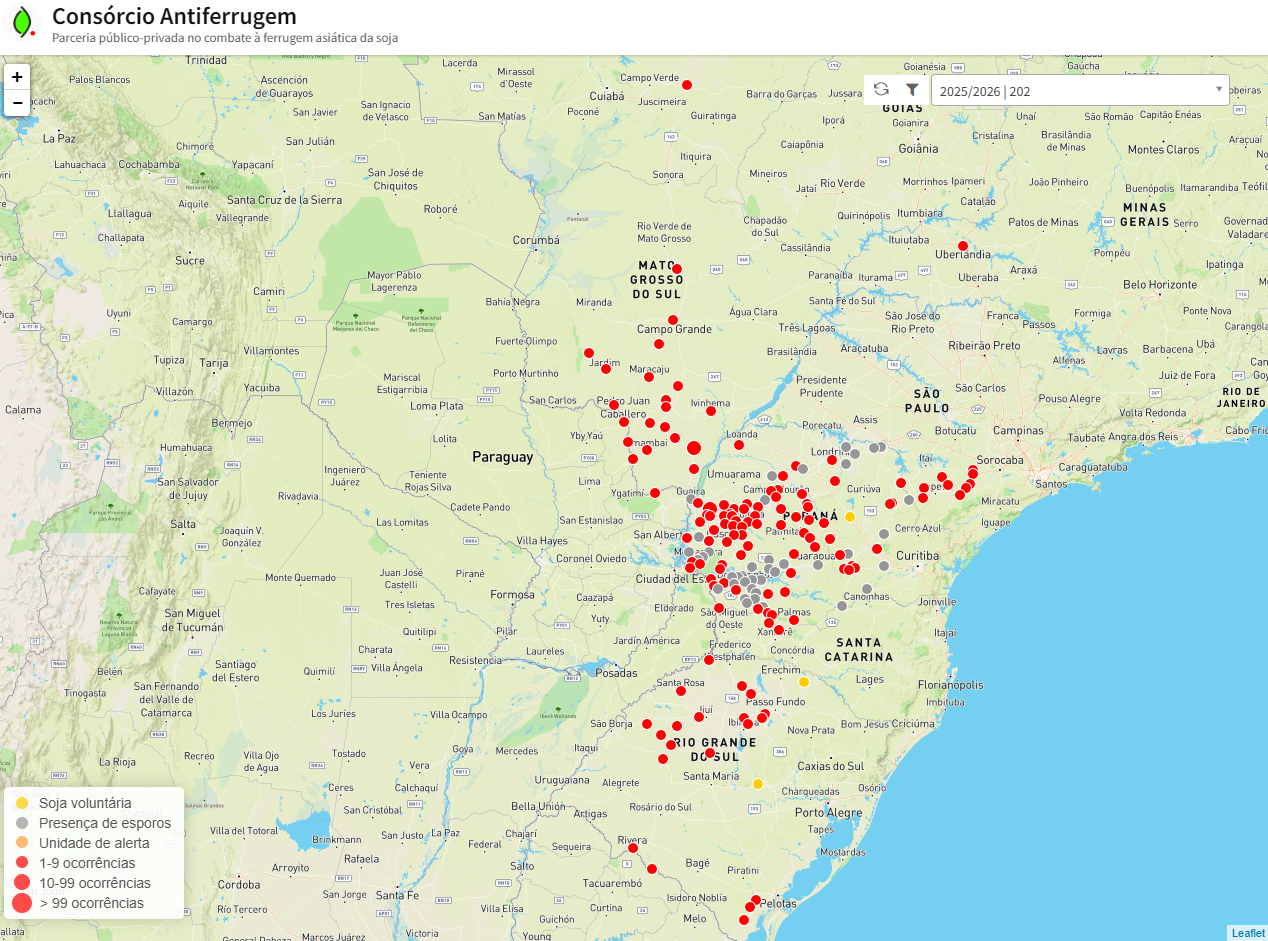 Ainda que medidas preventivas venham sendo adotadas para o manejo da ferrugem-asiática da soja, atualizações do Consórcio Antiferrugem demonstram um aumento significativo nos casos de ferrugem, especialmente no Sul do Brasil, nos estados do Paraná e Rio Grande do Sul. Atualmente, são relatados casos de ocorrência da ferrugem na safra 2025/2026 nos estados do Paraná (110 casos), Mato Grosso do Sul (58 casos), Rio Grande do Sul (25 casos), São Paulo (5 casos), Santa Catarina (2 casos), Mato Grosso (1 caso) e Minas Gerais (1 caso).