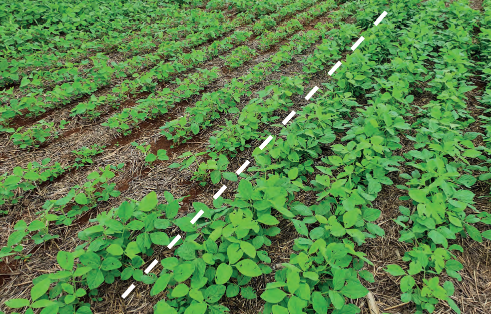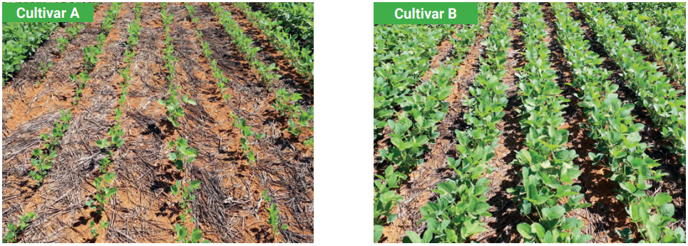 Figura 1. À esquerda, plantas de soja com clorose e de menor porte. Esses sintomas de fitotoxicidade são característicos da aplicação de herbicidas inibidores da ALS, como o imazetapir, no dia da semeadura da soja.