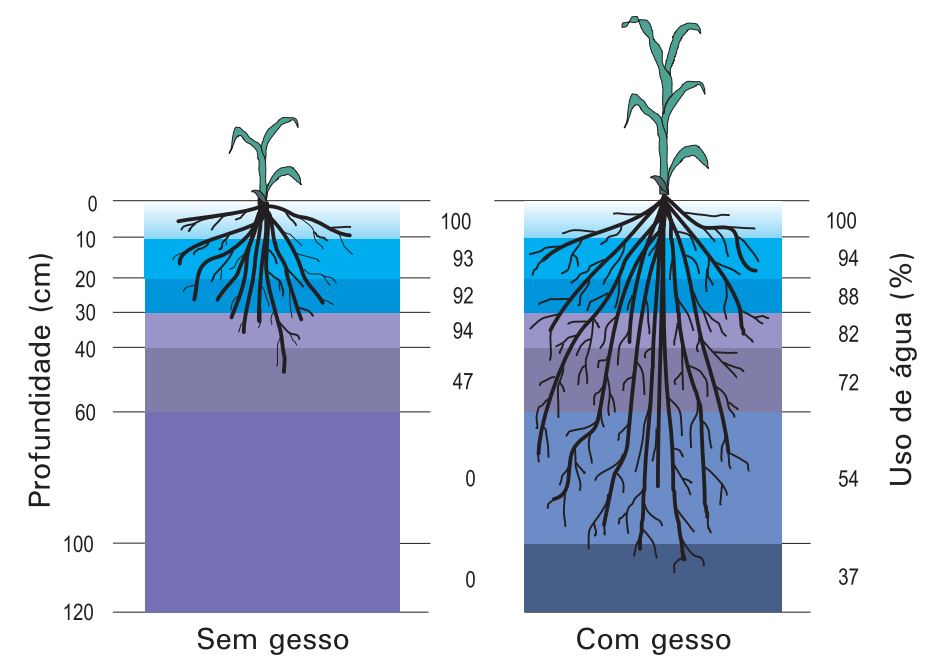 No entanto, sabe-se que o gesso agrícola não é capaz de elevar o pH do solo, logo, seu uso não é recomendado com essa finalidade. Contudo, estudos demonstram que o uso adequado do gesso agrícola favorece a distribuição de raízes no perfil do solo, melhorando características da planta como comprimento de raízes, o que pode ser importante sob condições de estresse hídrico por déficit hídrico (Santos et al., 2017). Resultados similares comprovando a melhor distribuição de raízes no perfil do solo em função da utilização do gesso agrícola também foram obtidos por Sousa; Lobato; Rein (2005).