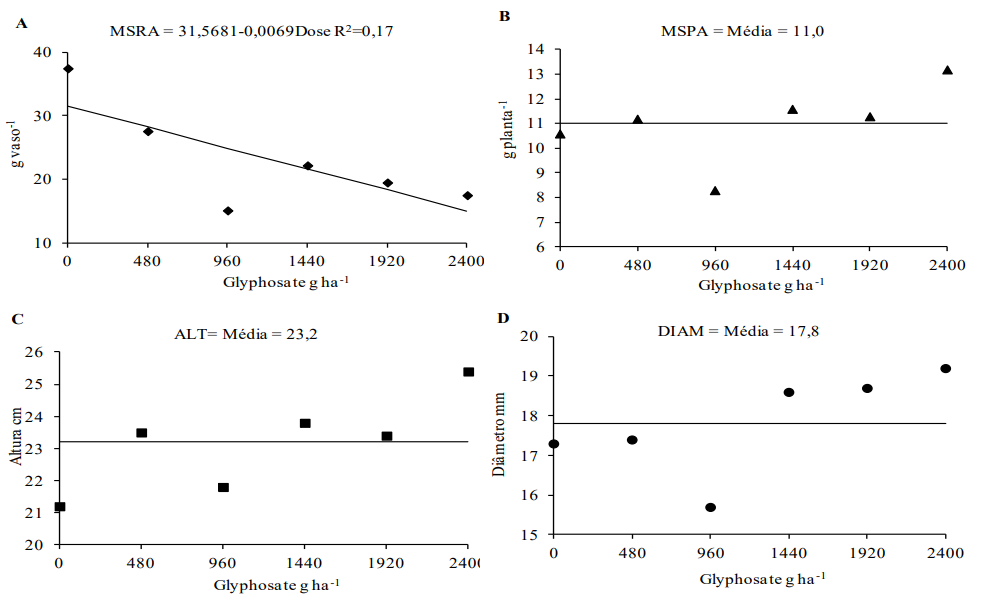 Figura 1. Dose resposta de glyphosate (glifosato) em milho RR para a variável-resposta Massa seca das raízes (A), Massa seca da parte aérea (B), Altura de plantas (C) e diâmetro de colmos (D) aos 14 dias após a aplicação dos tratamentos.