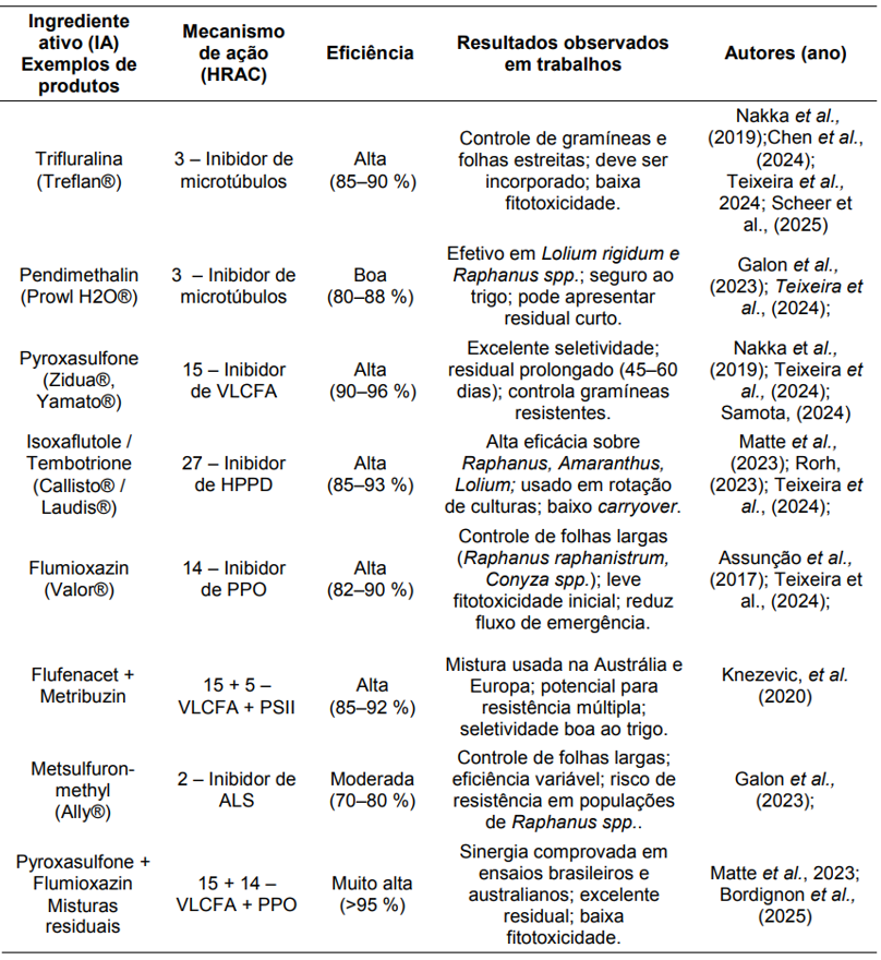 Auxiliando no posicionamento dos pré-emergentes em trigo, Silva et al. (2025) reuniram informações dos avanços recentes sobre a eficiência, seletividade e sustentabilidade dos herbicidas pré-emergentes, destacando os principais mecanismos de ação (HRAC), classes químicas e fatores edafoclimáticos que influenciam seu desempenho. Confira na tabela abaixo.