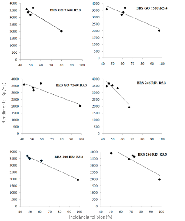 Figura 1. Relação entre incidência de folíolos (%) e rendimento de grãos (patossistema da soja x ferrugem asiática da soja) para BRS GO 7560 e BRS 246 RR no estágio fenológico R5.3, R5.4 e R5.5.