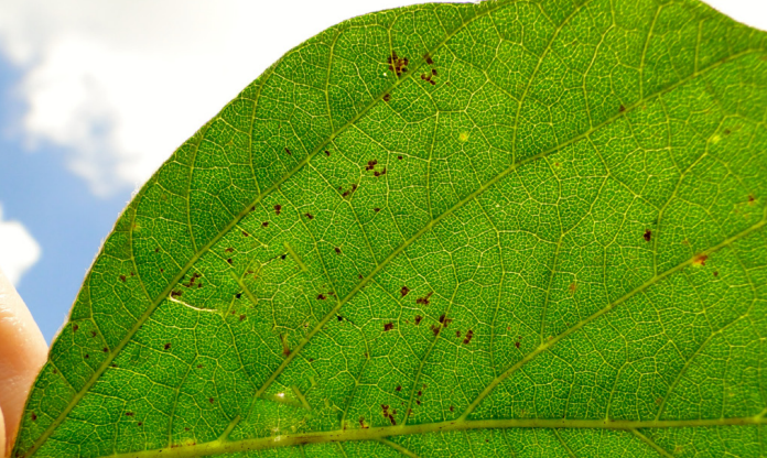 Figura 2. Folha de soja observada contra a luz. Pontos escuros podem ser sintomas da ferrugem-asiática.