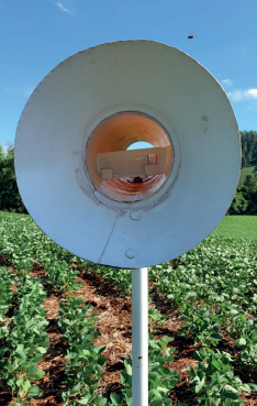 Já o coletor de esporos (figura 4), possibilita detectar os uredosporos do fungo causador da ferrugem-asiática, transportados pelo vento, antes da manifestação sintomática nas plantas, possibilitando assim o manejo técnico e econômico da doença (Oliveira et al., 2020). No entanto, não necessariamente a presença de esporos de ferrugem no coletor de esporos resulte na ocorrência da doença, uma vez que esporos inviáveis podem ser observados, e dependendo das condições ambientais a infecção pode não ocorrer. Contudo, o coletor de esporos é uma ferramenta auxiliar fundamental no manejo da ferrugem-asiática, servindo como alerta para a ocorrência da doença.