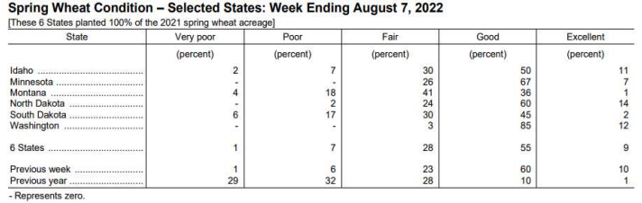 O relatório semanal de acompanhamento das lavouras americanas, divulgado nesta segunda-feira pelo USDA, registra que a colheita do trigo de primavera está bastante atrasada, com 9% colhido, até o último domingo, contra 35% na mesma semana do ano passado e 19% da média dos últimos cindo anos. Sobre as condições das lavouras ainda não colhidas, o USDA registrou piora de 6 p.p. na soma de bom+ excelente: 64%, contra 70% da semana anterior e 12% na mesma semana do ano passado