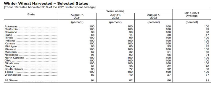 Exportações semanais EUA: O relatório semanal de Inspeções de Exportação do FGIS indicou embarques de trigo em 603.549 toneladas na semana que terminou em 4 de agosto. Isso foi quase o dobro da semana anterior, mas caiu 7,7% em relação à mesma semana em 2021. Embarques nos primeiros 2 meses do novo MY em 3,5 MMT, queda de