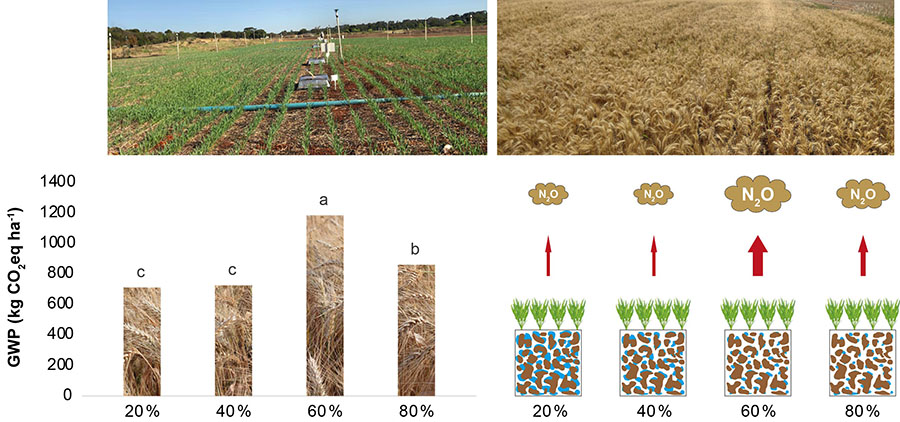 Com a reposição da água após o uso de 40% da capacidade da água disponível (CAD) do solo, o trigo alcançou a maior produtividade – 6,8 toneladas por hectare, com o menor índice de emissão de óxido nitroso (em média, inferior a 3,0 kg por hectare), gás quase 300 vezes mais potente que o dióxido de carbono (CO₂).
