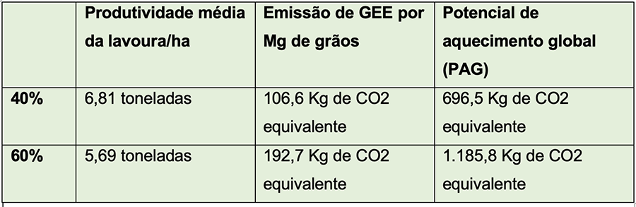 Já o pico de emissão de óxido nitroso foi atingido quando a reposição de água foi feita após o uso de 60% da CAD (5,69 toneladas por hectare), resultando no maior Potencial de Aquecimento Global (PAG) —1.185,8 quilos de CO2 equivalente, (ver tabela abaixo). Em comparação, o tratamento de 40% emitiu quase metade GEEs (-41,3%), ao mesmo tempo em que registrou quase 20% a mais de produtividade.