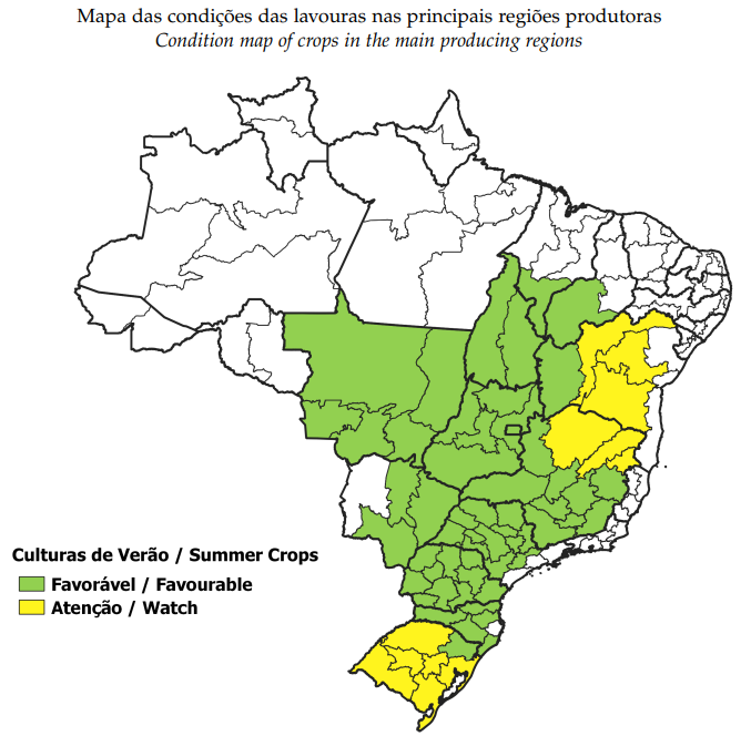 O dado mais recente mostra que os maiores volumes de chuva na primeira quinzena de fevereiro ocorreram nas regiões Norte e parte das regiões Centro-Oeste, Sudeste e Sul do país, favorecendo o desenvolvimento das lavouras e o início da segunda safra de grãos. Por outro lado, o excesso de precipitações em algumas áreas causaram danos pontuais às lavouras e interromperam as operações de colheita da primeira safra.