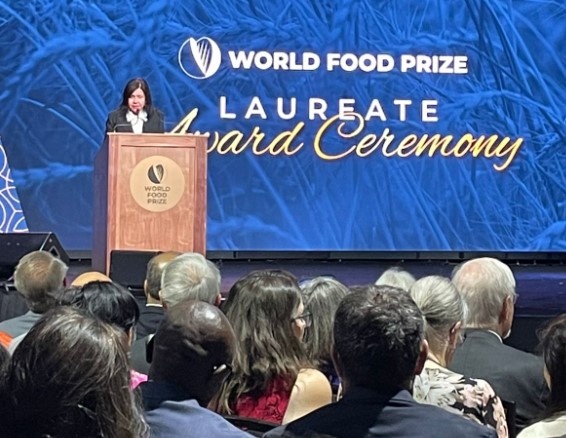 Mashal Husain, Presidente da Fundação World Food Prize, explica que o Prêmio Mundial de Alimentação reconhece pessoas que fortalecem a segurança alimentar global. Durante o evento ” Bourlaug Dialogue”, realizado em Des Moines, esta semana, estiveram reunidos cerca de mil representantes de 41 países – pioneiros em AgTech, líderes em agronegócio, cientistas, lideranças, agricultores, ministros da Agricultura, chefes de estado, CEO de bancos, entre outros. “Não há dúvida de que a Mariangela é uma cientista incrível: ela é exatamente o tipo de pessoa que Norman Borlaug estava procurando. Ela é alguém que conhece sua pesquisa, mas que compartilha os resultados com os agricultores. Dr. Borlaug sempre dizia: ‘Leve a mensagem para o agricultor”. E ele estaria incrivelmente orgulhoso hoje de saber que a Dra. Mariangela Hungria é a nossa 56ª Laureada do Prêmio Mundial de Alimentação”, destaca Mashal.