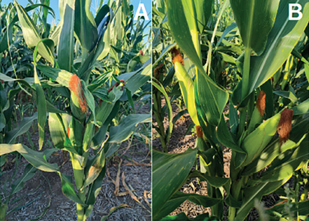 Figura 1. Híbrido prolífico (três espigas por colmo) (A). Híbrido prolífico e com perfilho viável (2 espigas por colmo, havendo colmo principal e ramificações) (B), em solos profundos no Sudoeste de Buenos Aires – Argentina.