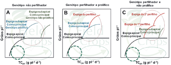 Em genótipos não prolíficos, o número de grãos por planta aumenta de forma assintótica em relação à taxa de crescimento vegetal. Já em genótipos prolíficos, essa resposta é mais linear em torno da floração, devido à contribuição da espiga subapical. Para genótipos com perfilhamento, a relação entre o número de grãos e a taxa de crescimento também é linear, incluindo grãos estabelecidos em espigas de perfilhos com taxas de crescimento superiores às observadas em plantas que expressam apenas prolificidade (Figura 2).