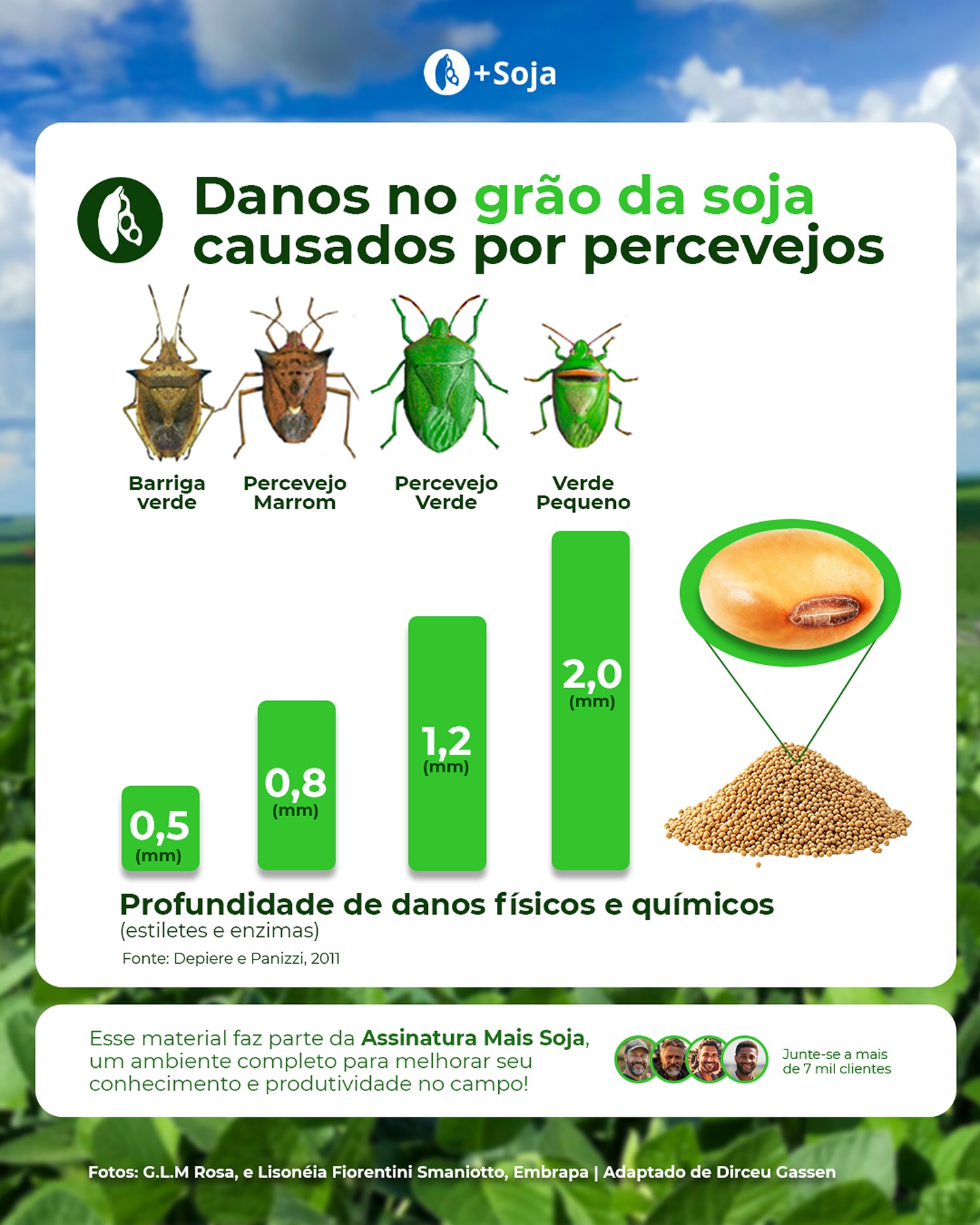 POZEBON, H. PERCEVEJOS DA SOJA: QUAL O POTENCIAL DE DANO DE CADA ESPÉCIE? Mais Soja, 2024. Disponível em: < https://maissoja.com.br/percevejos-da-soja-qual-o-potencial-de-dano-de-cada-especie/ >, acesso em: 03/11/2025.