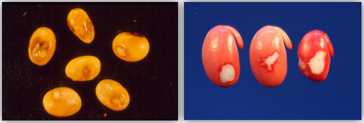 Figura 2. Sementes de soja com danos causados por picada de percevejo: à esquerda, sementes secas com danos típicos mostrando manchas de Nematospora coryli; à direita, sementes com danos de percevejo coloridas pelo sal de tetrazólio.