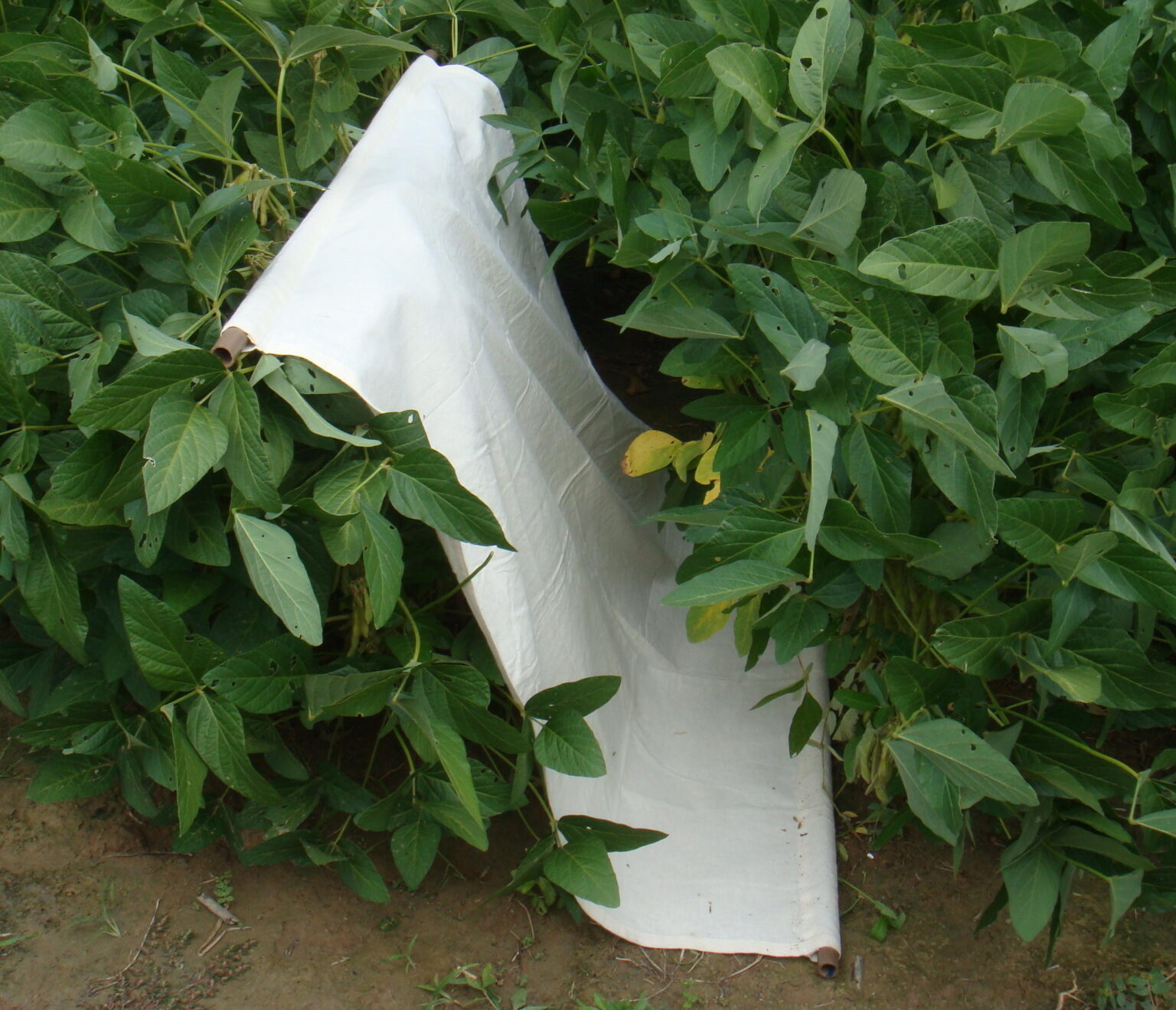 Recomenda-se que o monitoramento de percevejos na cultura da soja seja realizado principalmente por meio da amostragem com pano de batida. Para isso, o pano deve ser posicionado ainda enrolado entre as fileiras escolhidas, de modo que uma parte fique na base das plantas e a outra seja estendida sobre as plantas da fileira adjacente (Figura 4).