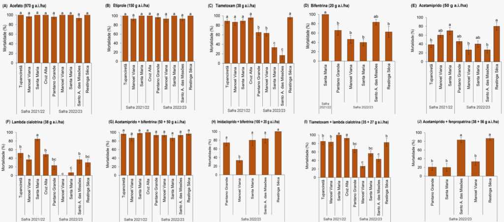 Figura 5. Variação geográfica na suscetibilidade de populações de Euschistus heros de diferentes regiões do Rio Grande do Sul à dose de campo de inseticidas selecionados em bioensaios dip-test. Barras (± desvio padrão) com letras diferentes diferem significativamente.