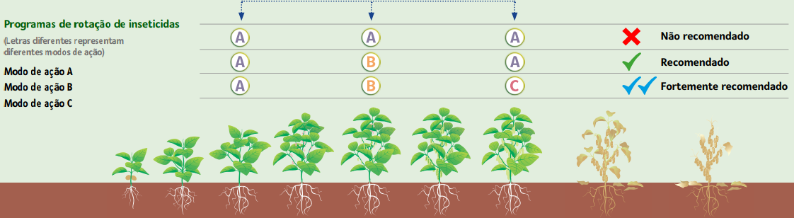 Em relação ao intervalo entre as janelas de aplicação (entendido como o tempo necessário para que a praga complete uma geração ou como a duração do efeito de uma única aplicação de inseticida), nem sempre é simples determinar esse período com precisão. Na ausência dessas informações específicas, o IRAC recomenda adotar uma janela de aproximadamente 30 dias para a maioria das pragas. Entretanto, durante a fase crítica de interferência dos percevejos na cultura da soja, o intervalo entre as janelas de aplicação deve ser definido com base no monitoramento frequente da lavoura, permitindo uma atuação proativa no controle da praga, assim que as infestações atingirem os níveis de ação pré-estabelecidos.