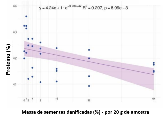 Vale destacar que além do impacto na produtividade e qualidade fisiológica das sementes, estudos demonstram que os percevejos podem reduzir atributos qualitativos dos grãos e sementes, como teor de proteínas, conforme observado por Marsaro Júnio et al. (2025). Avaliando o impacto que a alimentação do percevejo Euschistus heros causa na matéria seca das sementes de soja e nos teores de proteína, óleo e ácidos graxos, os autores identificaram uma associação negativa significativa entre as sementes danificadas e o conteúdo de proteína, indicando que a porcentagem desse componente diminui à medida que os níveis de dano aumentam (figura 7).