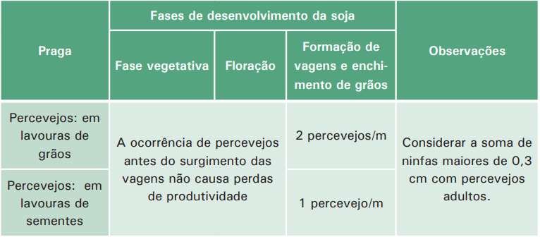 Dada a relevância dos danos ocasionados por percevejos na qualidade das sementes de soja, o nível de ação para o controle dos percevejos em lavouras destinadas a produção de sementes é mais criterioso em relação ao controle de populações da praga em lavouras produtoras de grãos. Tecnicamente, recomenda-se que o controle químico dos percevejos em lavouras produtoras de grãos ocorra ao observar 2 percevejos/m e em lavouras produtoras de sementes ao observar 1 percevejo/m, durante o período crítico de ocorrência da praga (Roggia et al., 2020).