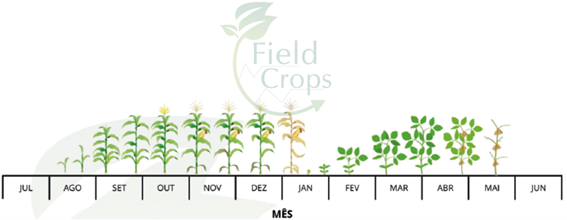O sistema de produção milho-soja safrinha é realizado em regiões no Sul do Brasil, como o oeste de Santa Catarina (SC) e o noroeste do Rio Grande do Sul (RS). Nessas regiões, devido à ocorrência de geadas durante o inverno o estabelecimento do milho após soja como é realizado no Centro-Oeste, se impossibilita, a isso se soma que a oscilação anual do fotoperíodo e as baixas temperaturas nos meses de agosto e setembro (meses frios e com dias curtos), geralmente, impedem a semeadura da soja neste período. Dessa forma, buscando otimizar o uso da terra, os produtores optam por semear a cultura do milho como primeira safra (agosto e setembro) e a soja como segunda (a partir de janeiro) (Figura 1).