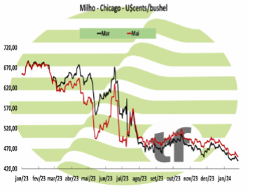 FECHAMENTOS DO DIA 29/01: A cotação de março24, referência para a nossa safra de verão, fechou em baixa de -1,34 % ou $ -6,00 cents/bushel a $ 440,25. A cotação para maio24, fechou em baixa de -1,15 % ou $ -5,25 cents/bushel a $ 450,50.