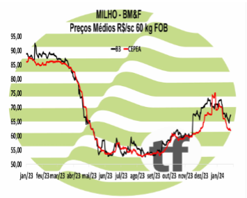 OS FECHAMENTOS DO DIA 29/01: Diante deste quadro, as cotações futuras fecharam em baixa: o vencimento de março/24 foi de R$ 64,30, baixa de R$ 1,27 no dia, baixa de R$ 0,32 na semana; maio/24 fechou a R$ 64,21, baixa de R$ 1,32 no dia, baixa de R$ 0,26 na semana; o vencimento julho/24 fechou a R$ 64,12, baixa de R$ 0,93 no dia e baixa de R$ 0,06 na semana;