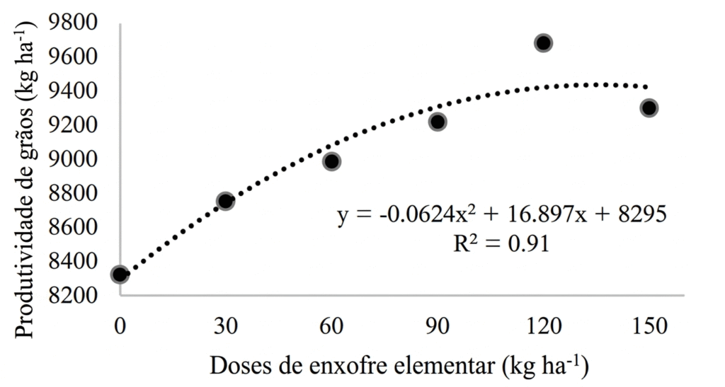 Nas condições do presente estudo, os resultados obtidos pelos autores demonstram que a adubação do milho com enxofre proporcionou ganho de produtividade de até 13% em relação a testemunha (sem adubação com enxofre), demonstrando de forma positiva a contribuição desse manejo para o aumento da produtividade do milho. No entanto, a relação da adubação com S e a produtividade do milho não é linear, sendo que, a produtividade máxima de grãos de milho, não foi obtida com a dose máxima avaliada (150 kg ha-1 de S elementar), e sim, com a dose estimada de 135,41 kg ha-1 S elementar (figura 1).