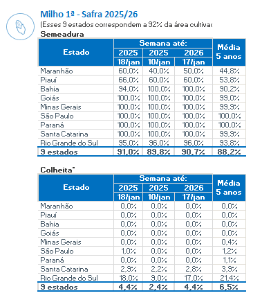 No PR, as boas precipitações ocorridas em janeiro ajudaram a consolidar o potencial produtivo das lavouras. Em SC, a colheita está no início e as produtividades têm refletido as boas condições climáticas. No MA, o plantio avança lentamente devido à irregularidade e falta de chuvas nas regiões produtoras.