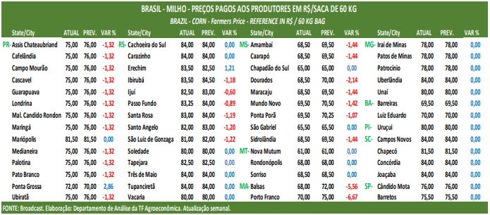 BRASIL: Uma consultoria privada brasileira informou que o plantio de milho 1ª safra atingiu 38,8% – acima dos 34% da semana passada e um pouco acima do ritmo de 37,9% do ano passado. O USDA deixou a produção brasileira inalterada em 126 MT e a Argentina em 55 MT.