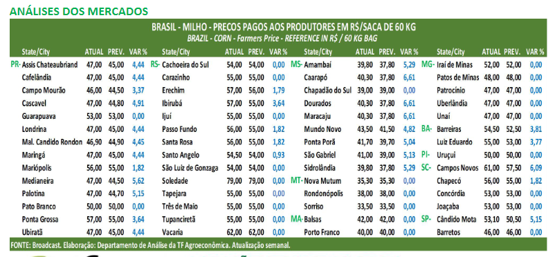 No porto, Indicações médias a R$ 63,50, com entrega dezembro, e pedidas a iniciar em R$ 65,00, com a maior parte dos lotes posicionados a R$ 70,00. No interior, indicações a partir de R$ 50,00 Cascavel e Pato Branco; R$ 51,00 Londrina; R$ 52,00 Maringá e R$ 55,00 Ponta Grossa. Sem relatos de negócios.