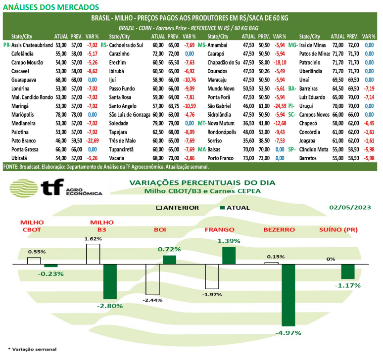CAUSAS DA BAIXA: O milho fechou em queda com os dados positivos sobre o avanço do plantio. O USDA divulgou após o fechamento da sessão de segunda que; 26% da área pretendida já foi plantada e está em linha com a média dos últimos 5 anos e acima dos 13% do ano passado. A grande safra brasileira de milho e os dados de uma maior exportação por parte da Ucrânia até abril também pesaram sobre as cotações.