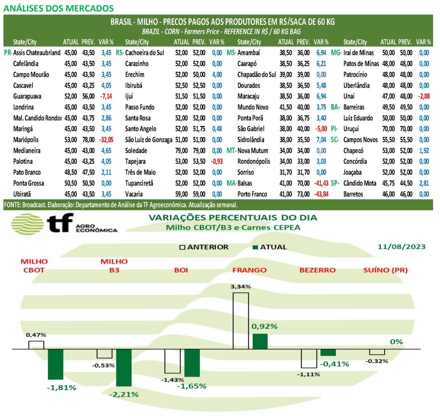 CAUSAS DA QUEDA: O milho negociado em Chicago fechou o dia e a semana em queda. Com uma batalha interna entre fatores altistas e baixistas no relatório WASDE do USDA, o milho acabou cedendo com um clima favorável e a forte concorrência externa. O USDA reduziu sua estimativa de produção nos EUA em 2023/24 para 15,111 bilhões de bushels (383,82 milhões de toneladas), em comparação a 15,32 bilhões de bushels (389,13 milhões de toneladas) em julho. Quanto aos estoques globais, a estimativa foi reduzida de 314,1 milhões para 311,1 milhões de toneladas. Os dados, apesar dos cortes, deixam os compradores relativamente mais tranquilos em relação à aquisição de matéria-prima. Sendo assim, a melhora no déficit hídrico, apontado pelo USDA no dia anterior, assim a forte pressão da concorrência internacional, principalmente vinda do Brasil e Argentina pressionaram a cotação. Com isso o milho fechou a semana em baixa de -2,01% ou $-10,00 cents/bushel para a cotação de dezembro23.
